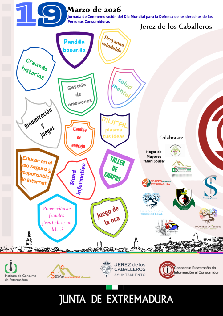 El Consorcio Extremeño de Información al Consumidor, órgano dependiente del Instituto de Consumo de Extremadura, conmemora este año 2026, mediante unas Jornadas que tendrán lugar el 19 de marzo en la localidad de Jerez de los Caballeros, el Día Mundial para la defensa de los derechos de las personas consumidoras. Estas jornadas contarán con actividades dirigidas tanto a escolares de educación infantil y primaria, como a la población adulta en general.