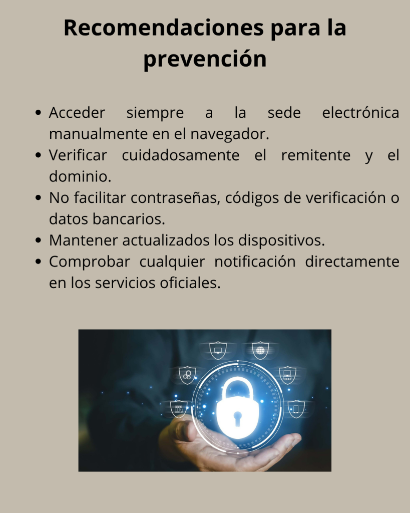 - Solicitudes de datos personales o bancarios a través de enlaces o formularios externos a la sede electrónica oficial.
