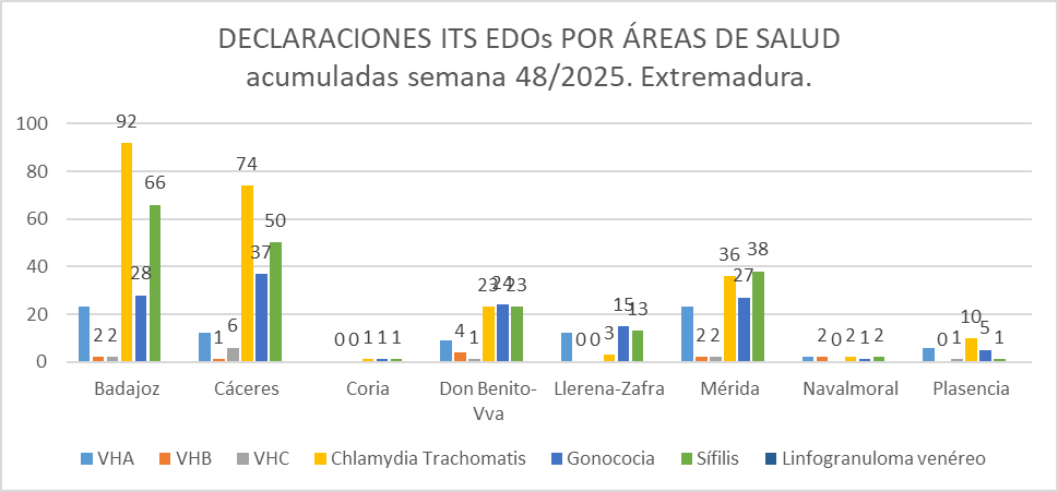 Como se observa en la gráfica, las áreas de salud con mayor incidencia de ITS declaradas son Badajoz (213) y Cáceres (180).
