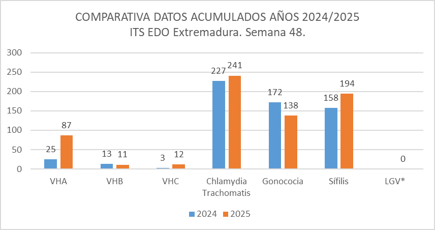 Respecto a las infecciones de transmisión sexual de declaración obligatoria, los casos acumulados declarados hasta la semana 48 del año 2025, son los siguientes:
