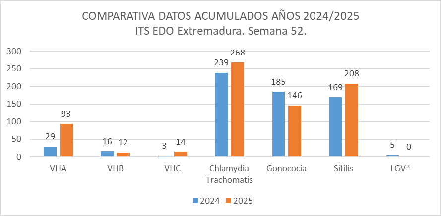 Respecto a las infecciones de transmisión sexual de declaración obligatoria, los casos acumulados declarados hasta la semana 52 del año 2025, son los siguientes: