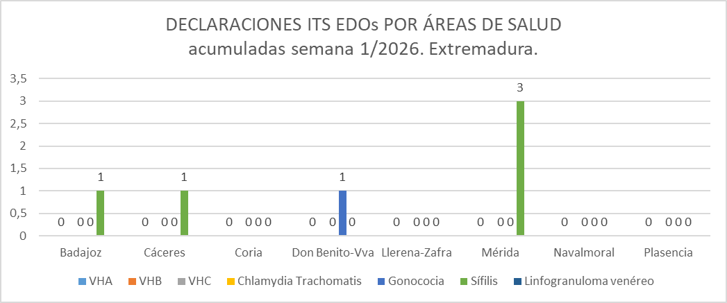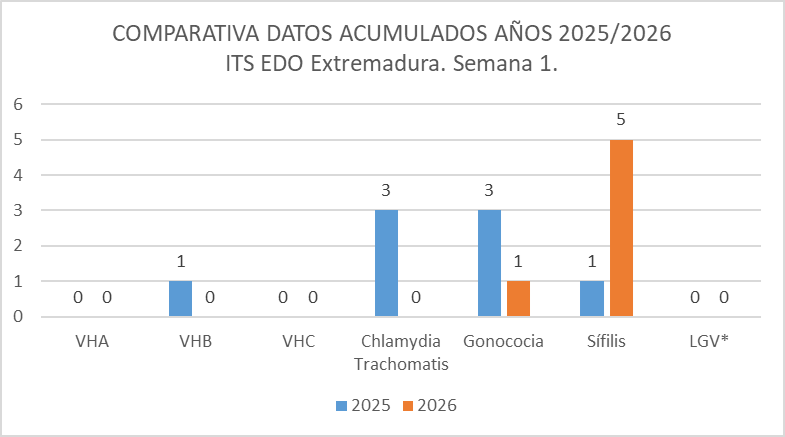 Respecto a las infecciones de transmisión sexual de declaración obligatoria, los casos acumulados declarados hasta la semana 1 del año 2026, son los siguientes: