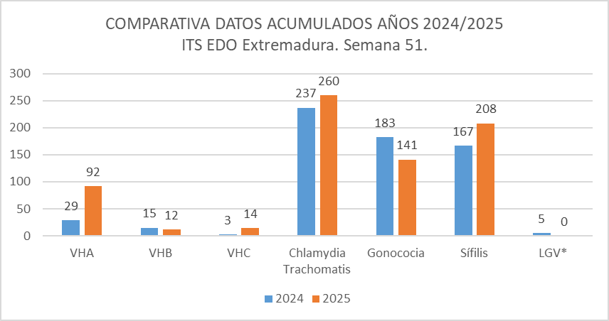 Respecto a las infecciones de transmisión sexual de declaración obligatoria, los casos acumulados declarados hasta la semana 51 del año 2025, son los siguientes:
