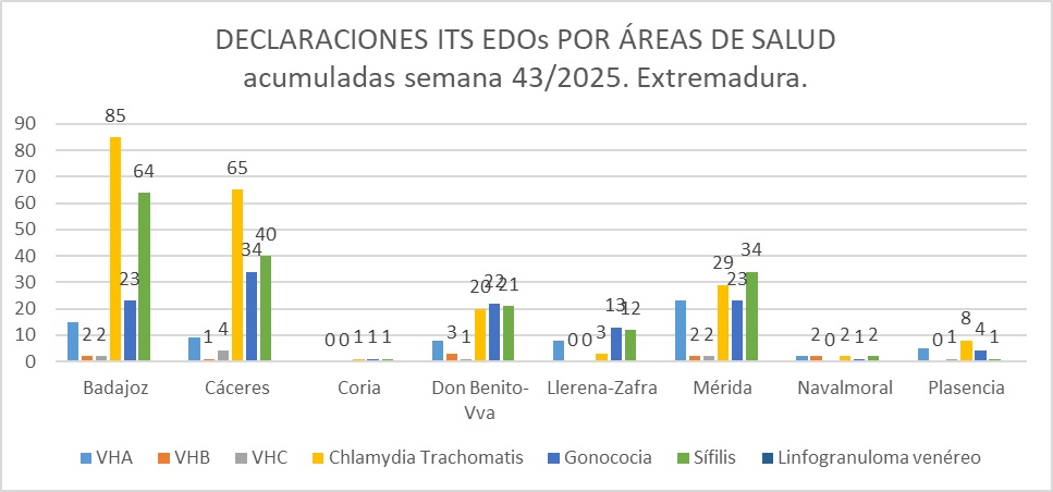 Como se observa en la gráfica, las áreas de salud con mayor incidencia de ITS declaradas son Badajoz (186) y Cáceres (148).