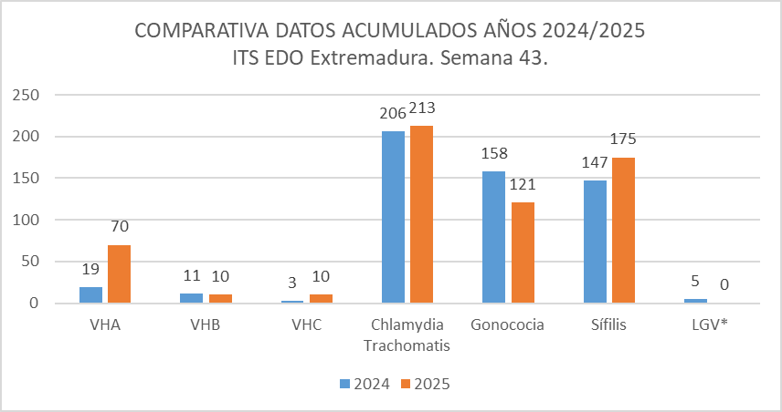 Respecto a las infecciones de transmisión sexual de declaración obligatoria, los casos acumulados declarados hasta la semana 42 del año 2025, son los siguientes: