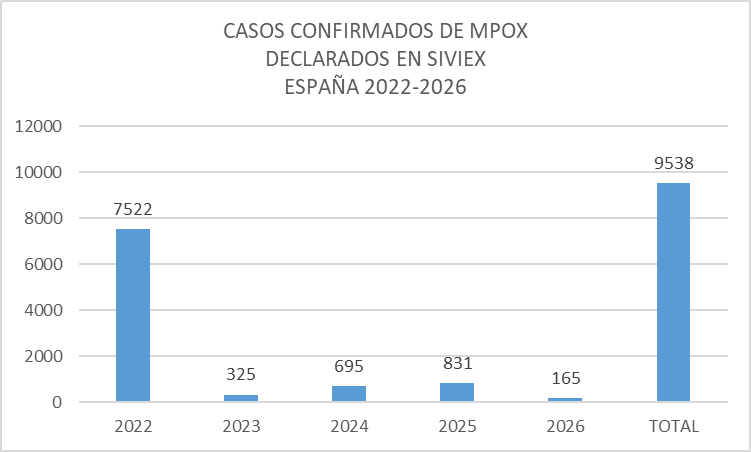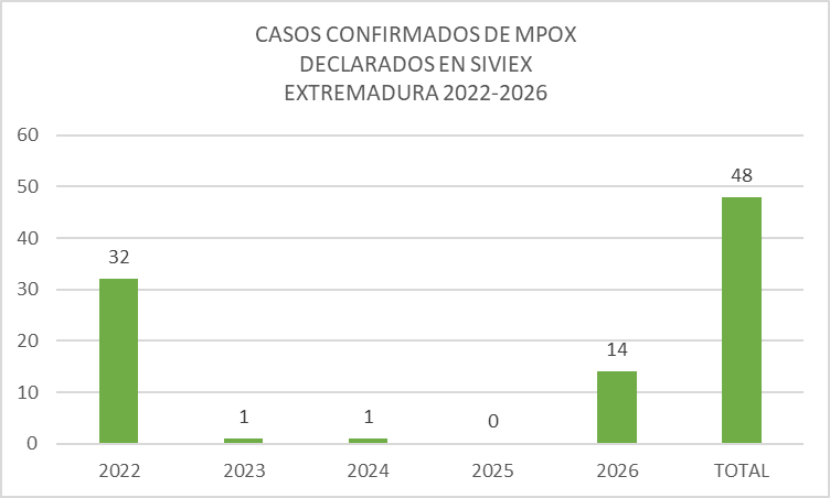 A fecha de esta actualización (06/04/2026) se han notificado un total de 9.538 casos confirmados de infección por mpox desde el inicio del brote en abril de 2022, procedentes de 17 Comunidades Autónomas, siendo confirmados y declarados 48 de los casos a Extremadura. A lo largo de 2026 se han declarado en SiViES 165 casos de mpox, habiendo sido confirmados 14 de ellos en Extremadura.