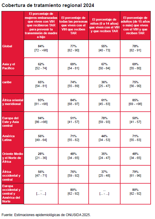- En 2024, el 77 % [62-90%] de todas las personas que vivían con el VIH tuvieron acceso al tratamiento.